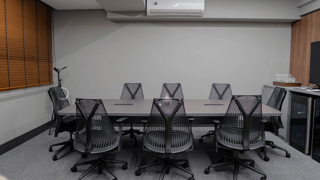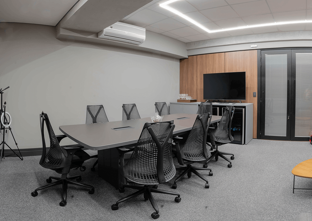 Para um escritório de alto padrão, temos uma variedade de linhas de mobiliário da Bortolini, mantendo a estética sofisticada da marca, com cadeiras Herman Miller e isolamento acústico com carpetes Interface e Divisórias Piso-Teto da DivDesign.